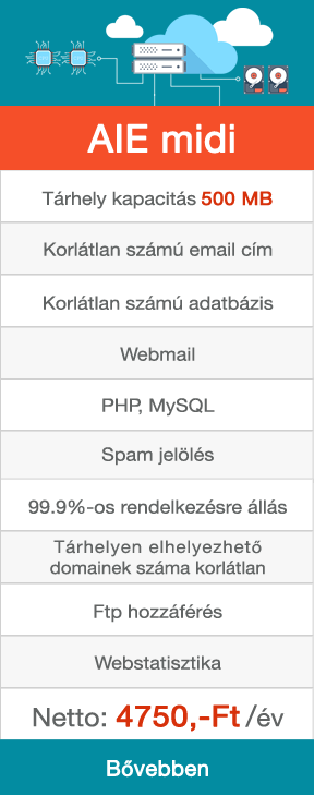 Több weboldalt vagy esetleg kisebb webáruházat üzemeltető Megrendelőinknek ajánljuk AIE midi hosting csomagunkat. A csomag minden paramétere (webtárhely, adatbázis tárhely, postafiók tárhely, alias domain száma) rugalmasan bővíthető, így az éves díj mindig a felhasznált terület függvényében változik.